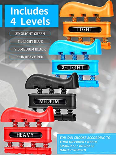 A szett négy különböző erősségű ujj erősítőt tartalmaz, amelyek mindegyike más-más színű: piros, kék, fekete és zöld. Ezek az eszközök műanyagból és rugóból készültek, így tartósak és könnyen kezelhetők. Az ujj erősítők mérete 8 x 9 cm, ami kényelmes fogást biztosít, és könnyen elfér a táskádban, így bárhová magaddal viheted.