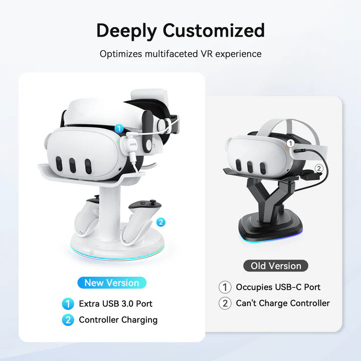 A töltőállomás USB 3.0 mágneses 3 az 1-ben csatlakozóval van felszerelve, ami lehetővé teszi a fejhevederek töltését is. Ez a csatlakozó nemcsak a töltést teszi gyorsabbá, hanem a VR játékok során is simább és akadásmentes élményt biztosít. Így nem kell aggódnod a lassú töltés vagy az akadozó játékélmény miatt.