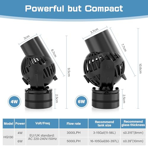 A hygger 6W akváriumi hullámpumpa lenyűgöző 5000 liter/óra teljesítménnyel rendelkezik, ami biztosítja, hogy az akváriumod vize mindig friss és oxigéndús legyen. Ez a pumpa ideális mind a kisebb, mind a nagyobb akváriumokhoz, hiszen könnyedén képes kezelni a különböző vízmennyiségeket. A 230V-os működés garantálja a stabil és megbízható teljesítményt, így nem kell aggódnod a vízminőség miatt.