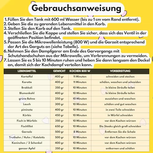 A Microwave Steamer gyorsfőzőt úgy tervezték, hogy a használata gyerekjáték legyen. Csak töltsd meg a tartályt a kedvenc zöldségeiddel vagy haladdal, adj hozzá egy kis vizet, és helyezd be a mikróba. Pár perc múlva már élvezheted is a friss, gőzölt ételeket. Nincs szükség külön edényekre vagy bonyolult beállításokra, így időt és energiát spórolhatsz meg.