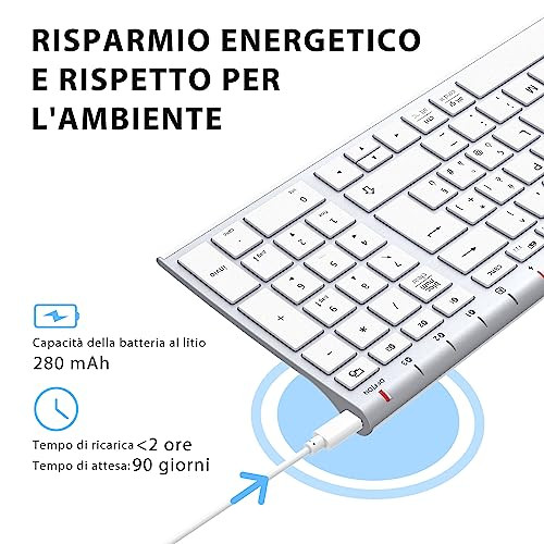 A Tastiera Bluetooth 5.1 billentyűzet nemcsak a funkcionalitásával, hanem a megjelenésével is lenyűgöz. A fehér szín eleganciát sugároz, míg az olasz kiosztás különleges ízt ad a gépelés élményének. Az ergonomikus kialakításnak köszönhetően hosszú órákon át kényelmesen használhatod, anélkül, hogy a kezed elfáradna. A nagy méretű numerikus pad pedig különösen hasznos, ha sok számítást végzel.